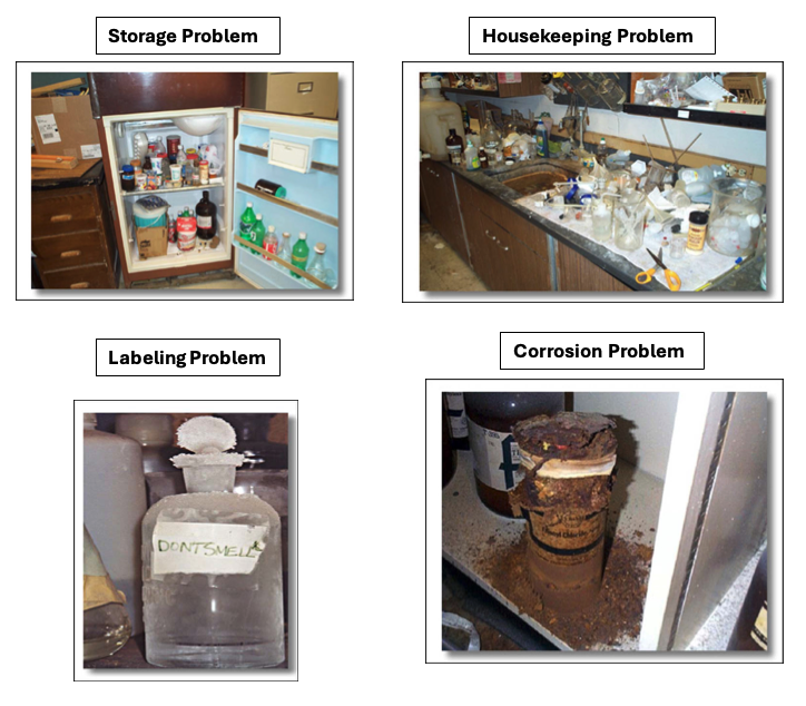 Problems can take many forms: poor storage, housekeeping issues, corrosion, labeling errors, or missing labels. Even properly labeled and stored chemicals can become dangerous if mishandled, as well as equipment that seems harmless, but can pose hazards if broken or used incorrectly.